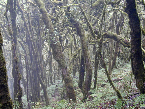 Wir liefen durch den Moosbehangenen Wald bis zu einem Rastplatz an der Fernverkehrsstraße. Die überquerten wir und gingen einige Zeit den Nordhang hinunter, wo die Passat-Wolken aufsteigen und alles durchfeuchten.