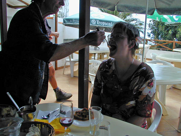Es gibt hier eine Zeremonie, die Donna Ephigenia an jedem Tisch selbst durchführt. Zuerst wird erklärt, was es Gutes gibt und dann bekommt einer der Gäste einen Bissen Gofio mit Mojo Rojo (gesprochen Mocho Rocho) verabreicht. Nett, und man braucht auch kein Spanisch zu verstehen und weiß trotzdem, was gemeint ist.